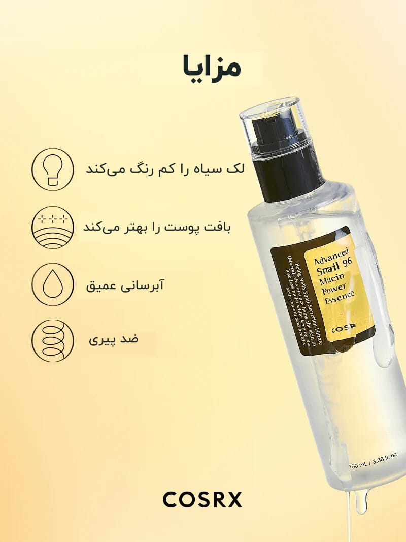 حاوی 96 درصد ترشحات حلزون ترمیم کننده قوی پوست تغذیه کننده و احیا کننده پوست روشن کننده و کاهش لک های پوستی تسکین دهنده و آرام کننده پوست کلاژن ساز و تحریک بازسازی سلولی ترمیم جای زخم و جوش آبرسان و مرطوب کننده ضد التهاب و باکتری کاهش خطوط ریز فاقد مواد مضر مناسب انواع پوست حتی پوست حساس